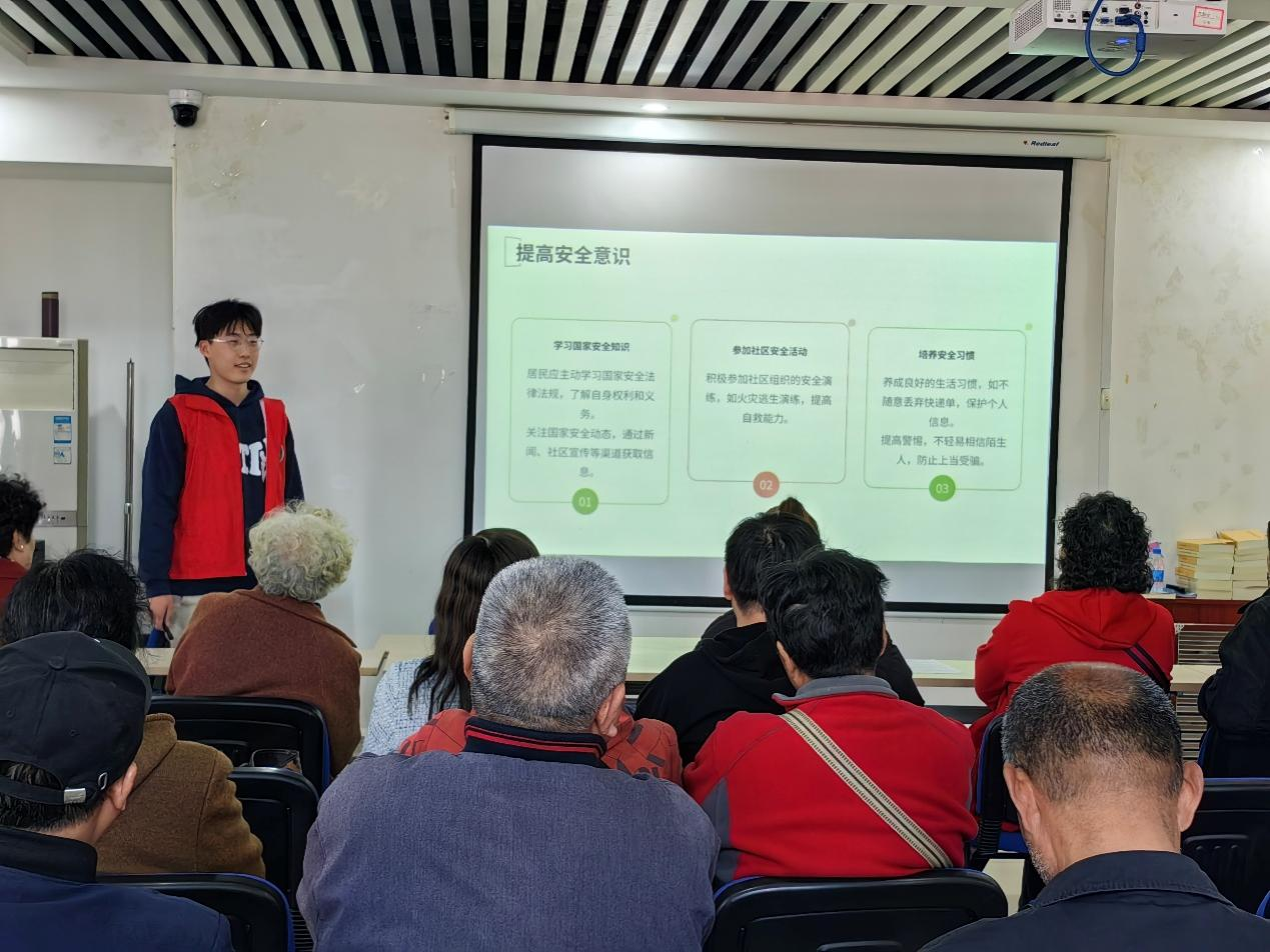 活动开始前,志愿者们精心布置会场,调试设备。活动过程中,志愿者们结合真实案例,从政治安全、网络安全、生态安全等多个维度,深入浅出地讲解国家安全的重要性及公民应履行的责任与义务。通过互动问答、情景模拟等形式,引导居民识别危害国家安全的潜在风险,掌握基础防范技能。现场气氛热烈,居民们积极参与讨论,“原来间谍可能就在身边,我们平时真得提高警惕!”一位社区居民感慨道。宣讲团成员还针对老年人常见的信息诈骗、网络安全隐患等问题,进行专项科普,帮助居民提升辨别能力。