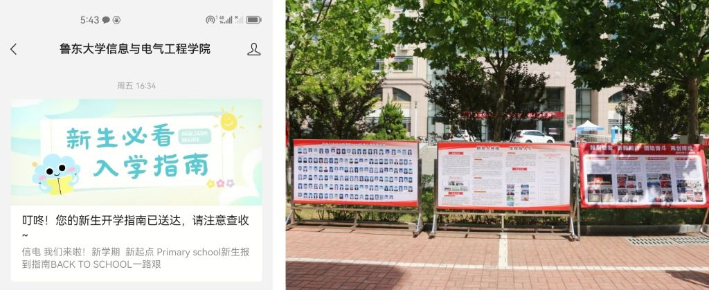 营造氛围重细节。学院充分利用QQ群、微信公众号等媒介推送新生物品准备、班级分配、报到流程等信息,帮助新生做好入学准备。同时,在主干道两侧悬挂迎新横幅和指示标识,方便学生熟悉学院路径。在报到现场展示迎新刊板,介绍学院专业、党建工作、考研就业等情况,增强新生对学院的认同感与归属感。学院以“线上+线下”的形式,为新生报到营造暖心氛围。