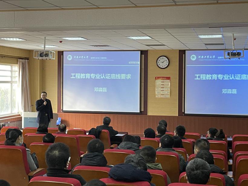 12月6日上午,河南省计算机学会常务理事、中国计算机学会郑州分部主席、河南省网络空间安全学科建设委员会委员、河南工业大学信息科学与工程学院院长邓淼磊教授应邀到我院分享工科类专业认证经验,深入探讨专业教育改革的新途径和新趋势。报告会由我校副校长邹海林教授主持,我院全体教职工、交通学院骨干教师聆听了本次报告。