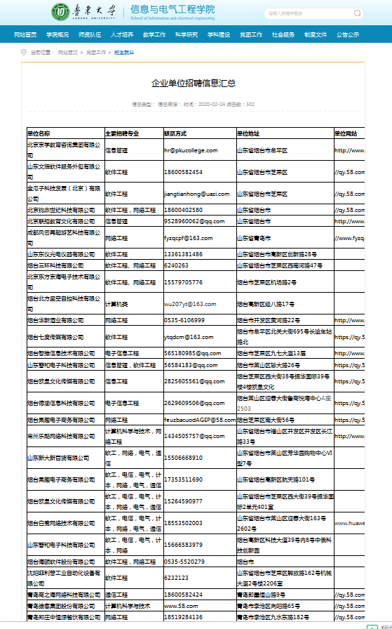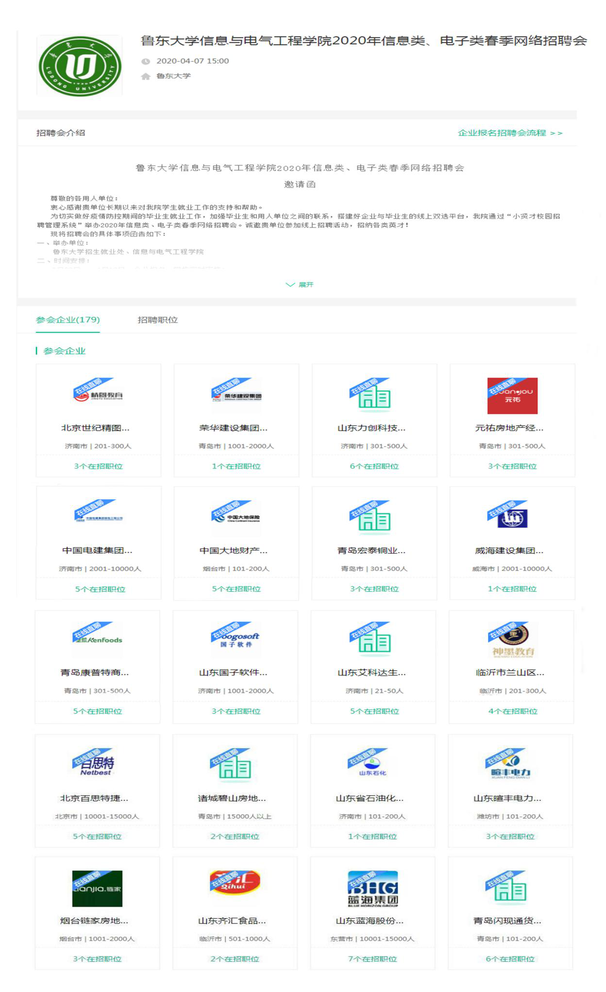 4月10日至4月13日,我院成功举办2020届信息类、电子类专业毕业生专场网络招聘会。信息与电气工程学院高度重视、认真准备,鲁东大学招生就业处全程调研指导,毕业生同学积极参与。本次招聘会完全采取网络在线形式,吸引来自省内外共计226家用人单位参与,发布用人职位800余个,提供就业岗位超过5000余个。其中招聘人数在20人以上的单位超过100余家,参会毕业生达3040人次。