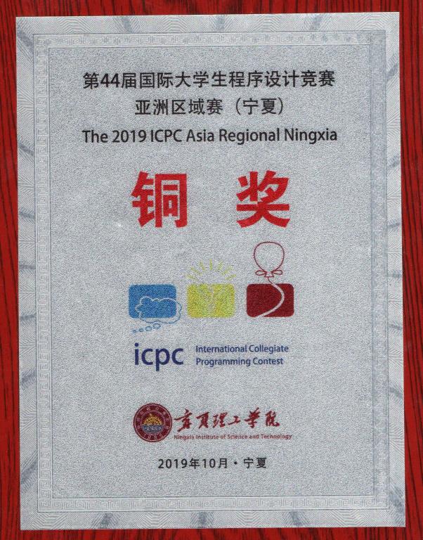 2019年10月20日,第四十四届国际大学生程序设计竞赛(International Collegiate Programming Contest,ICPC)亚洲区域赛(宁夏站)在宁夏举办。本次比赛云集了来自全国各地的398支参赛队伍近1600名参赛学生和教练员,其中包括清华、北大、浙大、复旦、南开、上海交大等985、211重点大学的优秀学子。在这群英荟萃的赛场上,我校派出三支优秀队伍与之角逐,在五个小时的艰难奋斗下,我校代表队伍秉承着永不言败,永不放弃的精神,顽强拼搏,发扬鲁东学子的优秀风采,最终我校17级软件工程专业朱振扬、刘明宸和吴胜营组成的代表队在近400支队伍中排名87,获得了亚洲区域赛银牌,17级软件工程李运来、18级软件工程谢文光和程昊组成的代表队获得了铜牌!