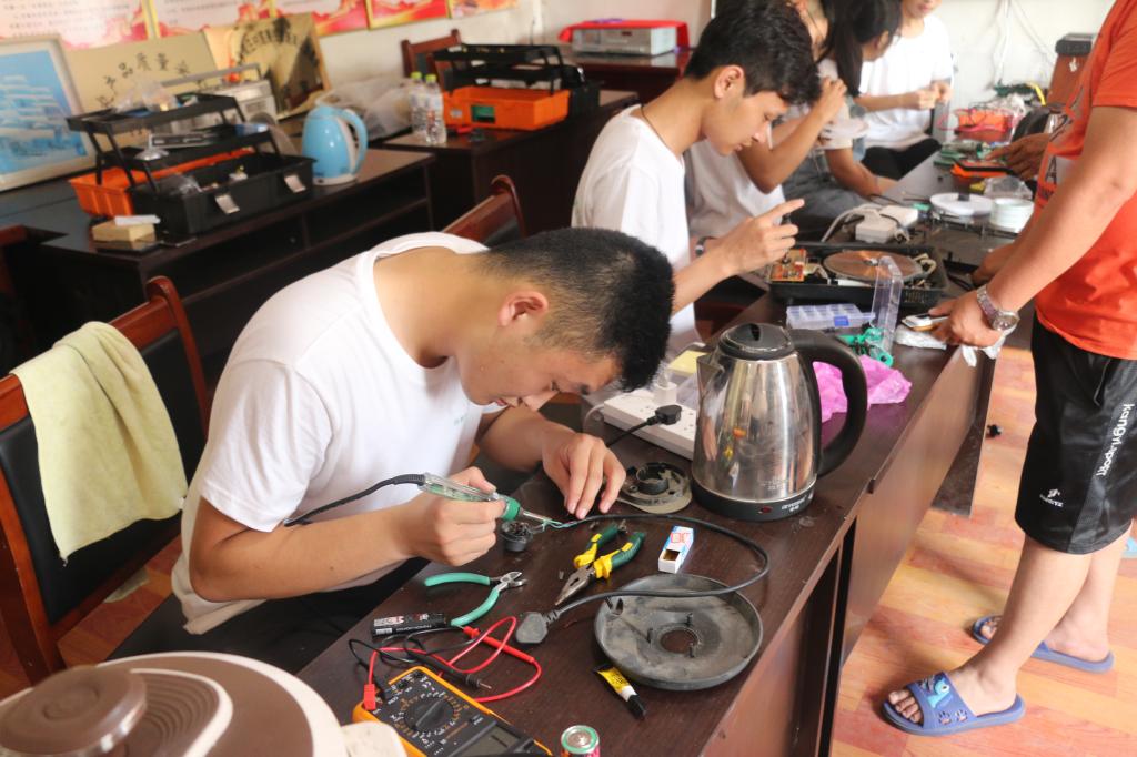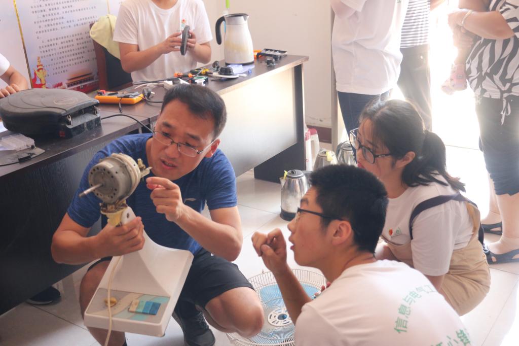 7月13日到达刘营伍乡政府,开展为期一个多周的社会实践活动,启动仪式结束后,刘营伍乡工作人员带领全体实践人员参观了村庄,了解村中情况,以便工作更好的展开。此次实践活动主要集中在周庄、刘旺言村、龙潭村、宋庄、商西村等五个村庄,成员们带着饱满的热情,每天提前到达,等待着前来维修的村民们,村里的温度高达34度,但看着村民们带着满意的笑容幸福而归,即使再炎热的环境也阻挡不了团员们的服务热情。实践团成员舍弃中午和晚上的休息时间,走访各村各户,为村民们解答用电知识,科普家电使用方法,共维修家电300余件。
