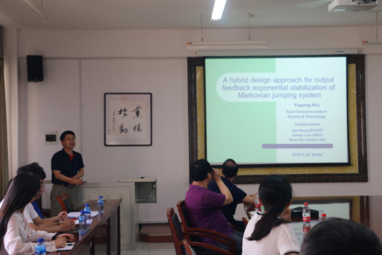 牛玉刚教授的报告题目是A hyhird design approach for output feedback exponential stabilization of Markoyian jumping system,他系统地介绍了就建立保证Markov系统指数稳定时转移概率存在的充要条件,转移概率和输出反馈控制率协同设计方法等问题给予讲解,并得出创新性结论;张维海教授的报告题目是离散随机系统某些研究主题的思考和评论,他分析了离散随机系统H∞控制等问题,并得出非线性离散随机系统研究具有一定的难度,与连续时间Ito系统相比,某些主题的研究还存在滞后性。