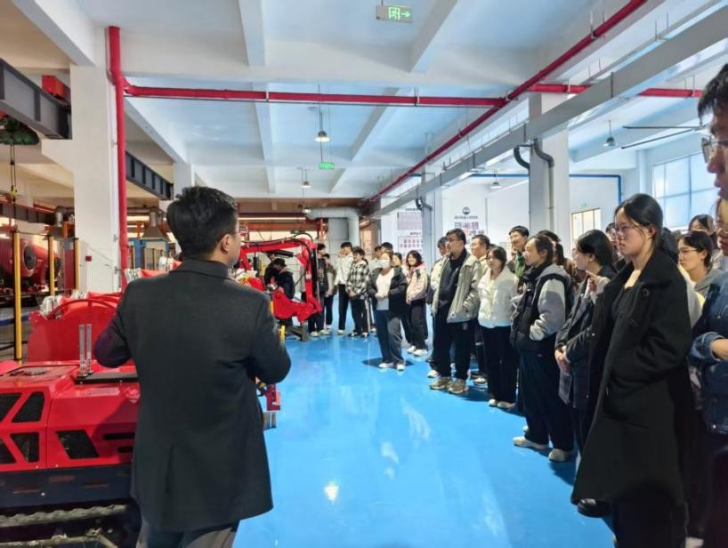 首站走进亿为科技,同学们先驻足专利展示区,满墙专利证书直观彰显企业在机器人领域的科研实力,讲解员介绍核心专利的研发背景与突破点,让大家深悟科研创新对产业的驱动作用;随后在技术展区,轨道上的智能巡检机器人凭借精准传感器与灵活移动系统,以及在工业安防等场景的应用,让同学们看到技术落地价值,技术人员还演示小型轮式机器人、拆解导航与环境感知原理,同学们围绕专业问题踊跃提问,深化了技术认知。告别亿为科技,队伍随即抵达国兴智能,展示区阵列的红色消防机器人 “天团” 即刻吸引目光,讲解员结合设备实体,将机器人构造、工作原理与专业理论对应讲解,帮同学们打通 “书本知识” 与 “实践应用” 的衔接;场外实操演示环节中,大家近距离观察作业流程,技术人员同步解析技术逻辑,呈现专业知识破解行业痛点的过程,互动时同学们围绕技术细节、行业趋势发问,讲解员耐心答疑之余,还结合人才需求梳理学业重点与职业路径,鼓励大家深耕专业。