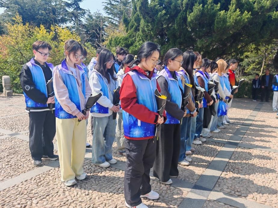 上午10时,全体同学在烟台山抗日烈士纪念碑前整齐列队、神情庄重,在主持人引导下齐声奏唱中华人民共和国国歌。随后,学生代表依次向纪念碑敬献花束,全体人员垂首默哀一分钟,以最诚挚的敬意,悼念为民族解放与人民幸福英勇献身的革命先烈。默哀毕,全体师生向革命先烈行三鞠躬礼,在庄重肃穆的仪式中寄托哀思,深刻感悟红色精神的时代内涵与使命担当。